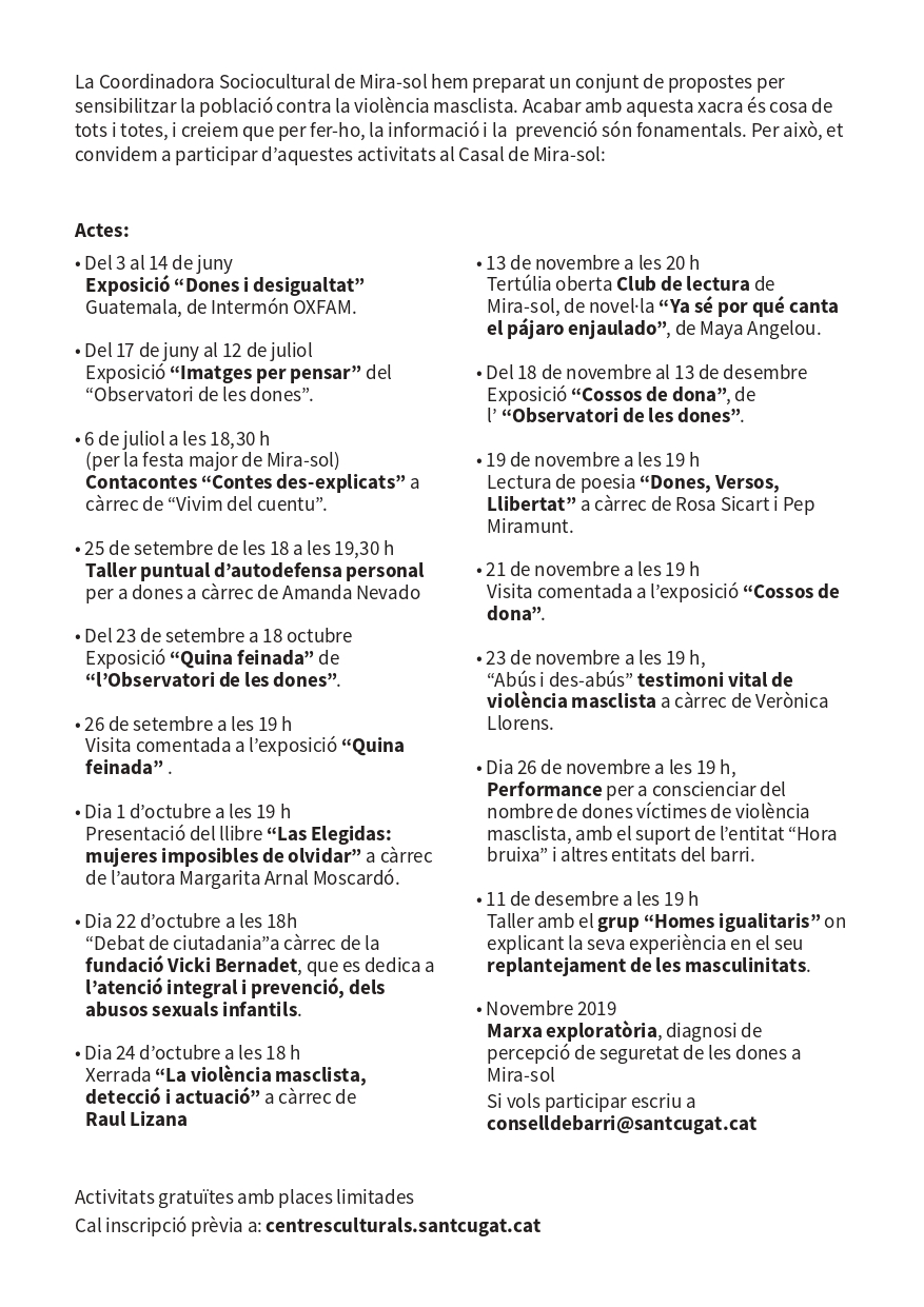 - Objectiu: Informar i sensibilitzar la població de Mira-sol sobre la problemàtica de la violència masclista per ajudar a prevenir-la.