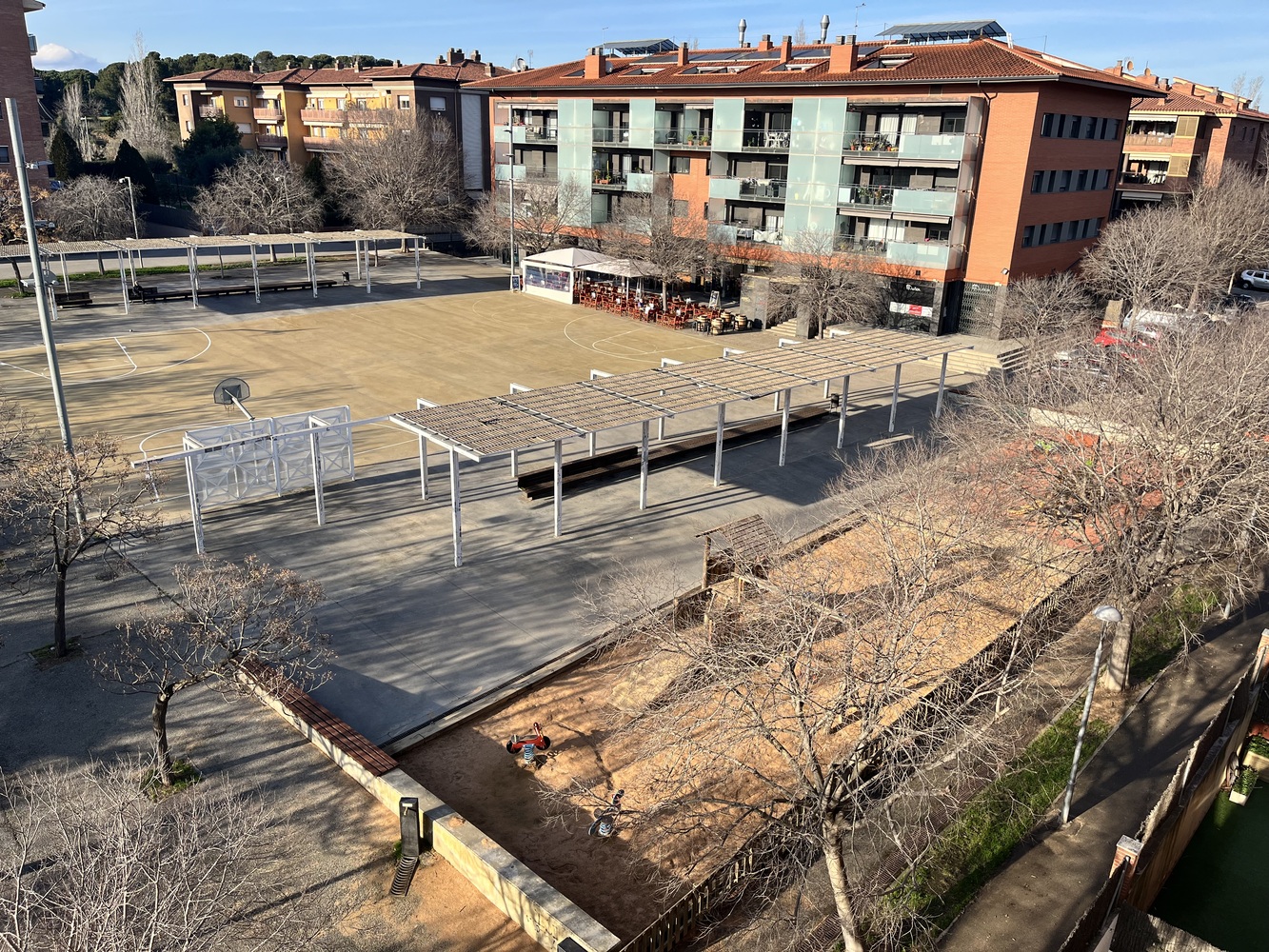 Instal•lació d’una xarxa o d’un element que separi les pistes de bàsquet/fútbol del parc infantil, per evitar les pilotades al cap de nens petits que estan al parc jugant que són molt perilloses. #collfava