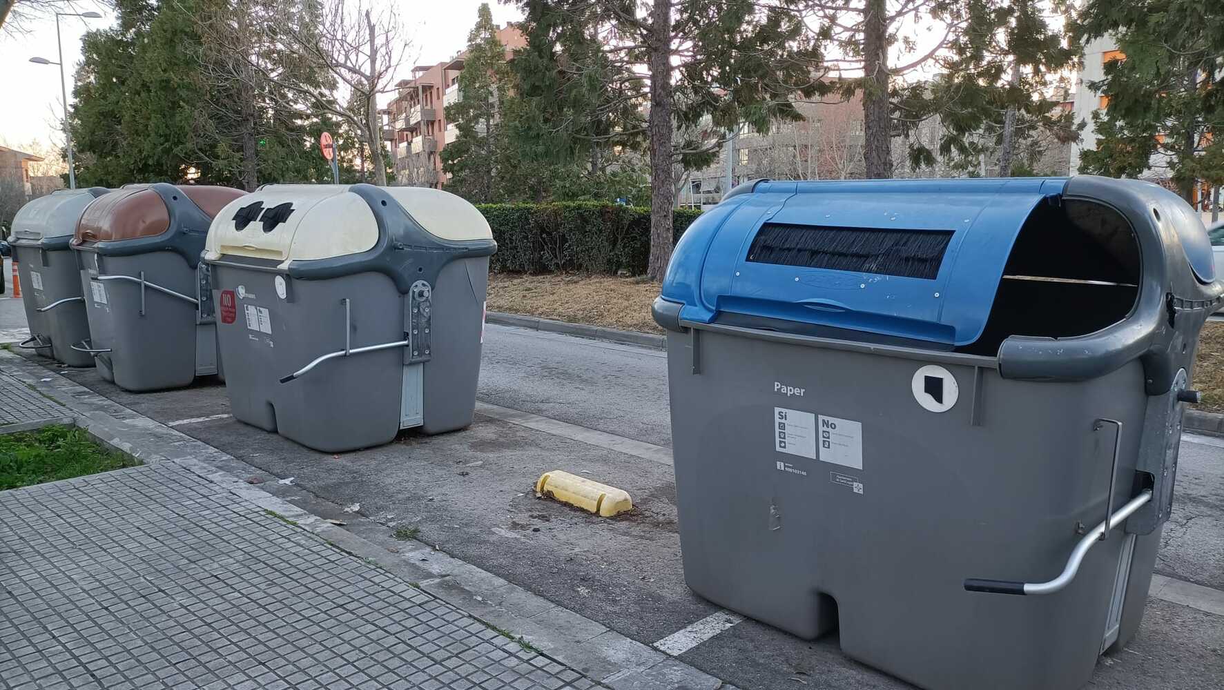 Portem molt de temps amb els contenidors amb les palanques, tan dels peus com de les mans, trencades, i es fa molt difícil llençar la brossa reciclant-la, per que necessites una ma lliure per aixecar la tapa, que a més pesa bastant.