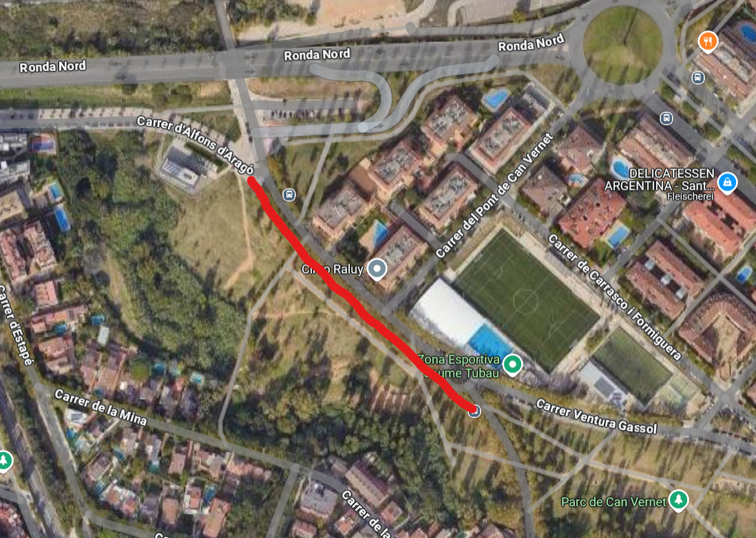 Aquest tram de carril bici serà la continuació del carril bici ja existent del Carrer d'Alfons d'Aragó i hauria de connectar amb els camins interiors del Parc de Can Vernet, que comencen a l'alçada del Carrer Ventura Gassol.