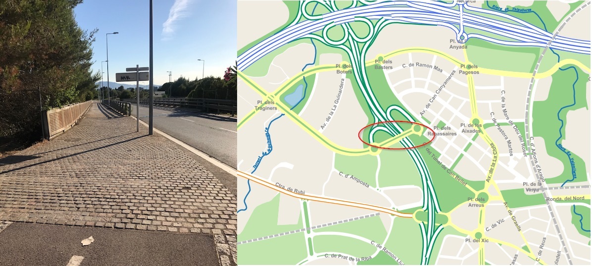 Es proposa instal·lar elements naturals (arbres, arbustos i gespa) per tal de transformar el pont per a vianants i crear una connexió de barris amb continuïtat voreres i carril bici. Sense possible interacció amb tràfic rodat.