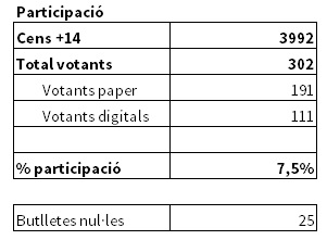 En la votació hi ha participat un total de 302 florestans/es sobre un cens de 3992 empadronats/es al barri majors de 14 anys. (7,5% del cens).