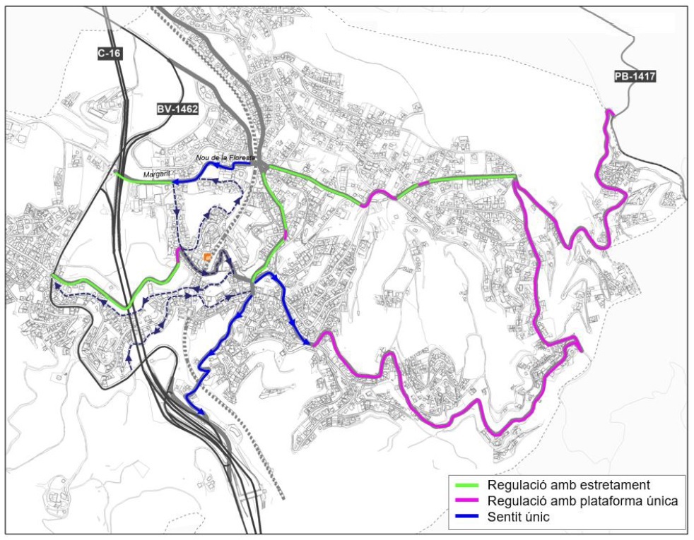 - Senyalització especifica en les portes d’accés del barri (amb senyalització vertical, horitzontal i amb un disseny urbanístic homogeni) per induir els conductors a reduir la seva velocitat en l’àmbit de la Floresta.